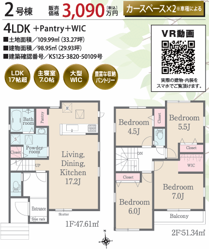 | 土地面積 | 109.99m2~113.43m2 | 建物面積 | 98.94m2~98.95m2 |
