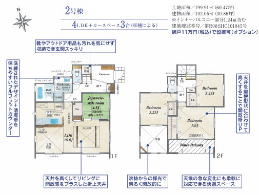 | 土地面積 | 199.91m2~201.75m2 | 建物面積 | 92.46m2~102.05m2 |