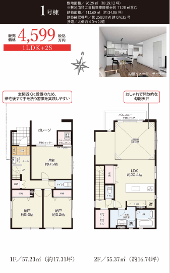 | 土地面積 | 95.51m2~96.29m2 | 建物面積 | 112.59m2~112.6m2 |
