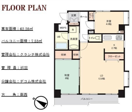 | 専有面積 | 62.28m² | バルコニー面積 | 7.53m² |